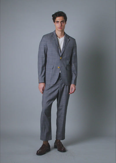 This tropical wool blend plaid blazer is sophisticatedly constructed. The idea of this slim-fit jacket is to wear it dressed up or with more casual/cool attire—a juxtaposition of style. Beyond the specialized tailoring, the beauty lies in the details, such as the hideaway cross-over tab collar, functional cuff buttons with signature grosgrain tape, and interior holding straps that allow you to carry it over your shoulder. The gold-tone buttons add an unexpected contrast of opulence and edge. It can be worn as shown or with the collar and lapel lifted, fully buttoning the front closure. Pair this with the Vtg Plaid Boxer Fit Trouser to complete the set.