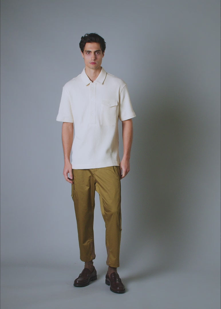 Achieve a vintage-inspired modern look with this relaxed-fit (RLX) Polo. Designed with a structured collar that buttons up to function as a wind guard and a three-button elongated placket. A flap chest pocket adds a utilitarian touch, while side hem snap buttons offer versatility. The polo shirt originated in the late 19th century as attire for polo players, featuring a button-up design for style and practicality. Later, it gained popularity in industries like construction and manufacturing for its rugged construction and comfort, making it ideal for labor demands. This particular polo was inspired by a vintage workwear polo used by mechanics in the automobile industry, sourced from our vintage vaults.