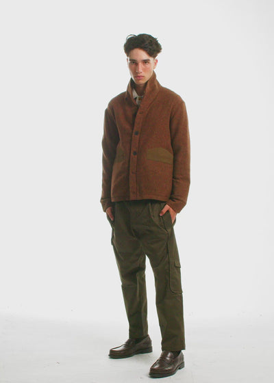 This durable, wool-blend cardigan can be worn as a light jacket or mid-layer. The beauty of this piece lies in its details, including reinforced pocket facings, a shawl collar, and elbow patches. The interior is finished like a tailored jacket with our signature yellow seam cover trim. In true Descendant of Thieves fashion, it's unnecessarily well-made, destined to be rediscovered by your unborn grandchild in future vintage shops that don't yet exist.