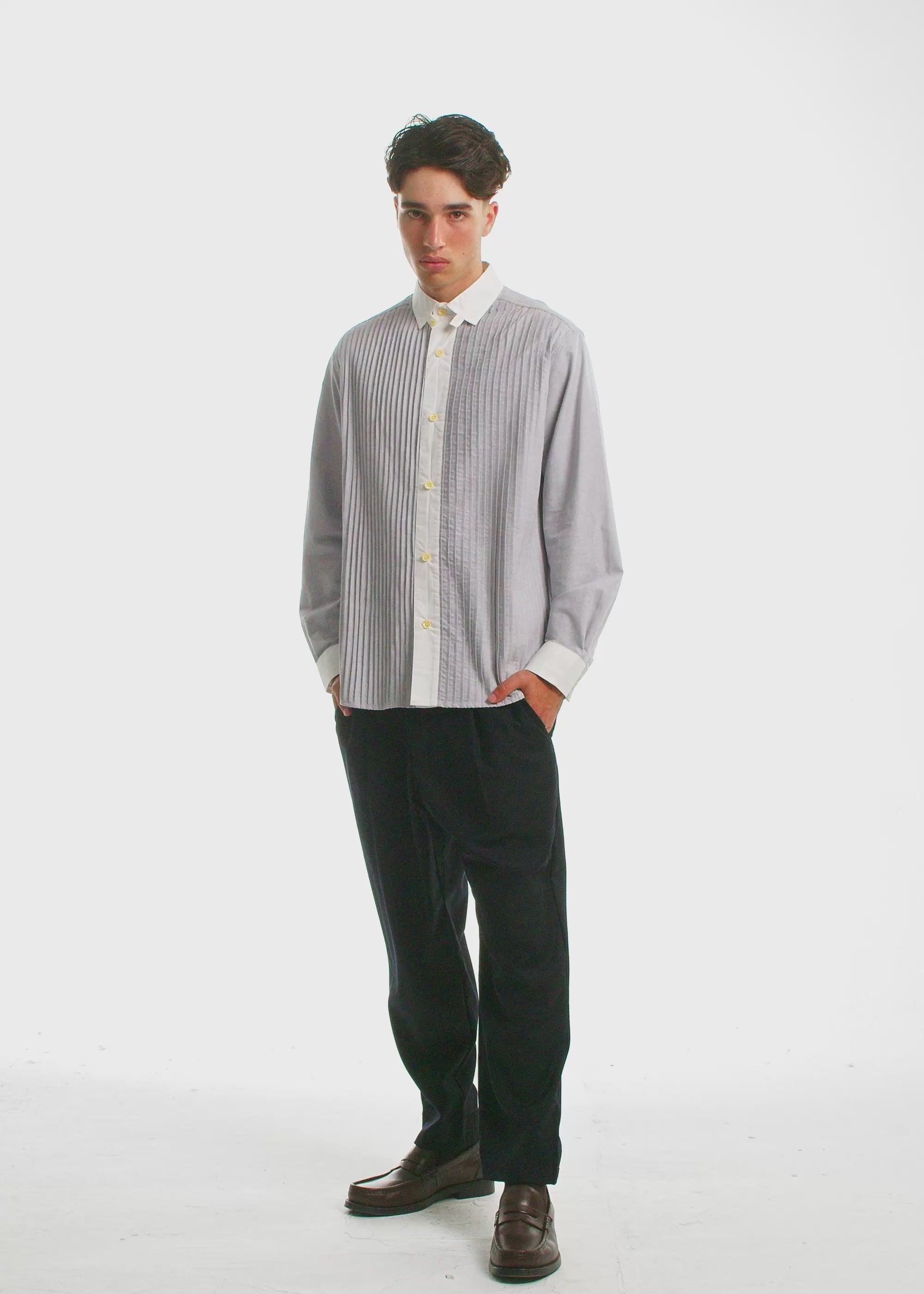 The pin-tuck shirt was once a mark of precision tailoring: rows of narrow folds stitched by hand to create depth. Each tuck is sewn line by line by our tailors. We took a tradition and relaxed it. Cut from classic Oxford cloth, made to be worn casually. The old-school tab collar turns up the edge. Made by hand in small batches for those who move differently.