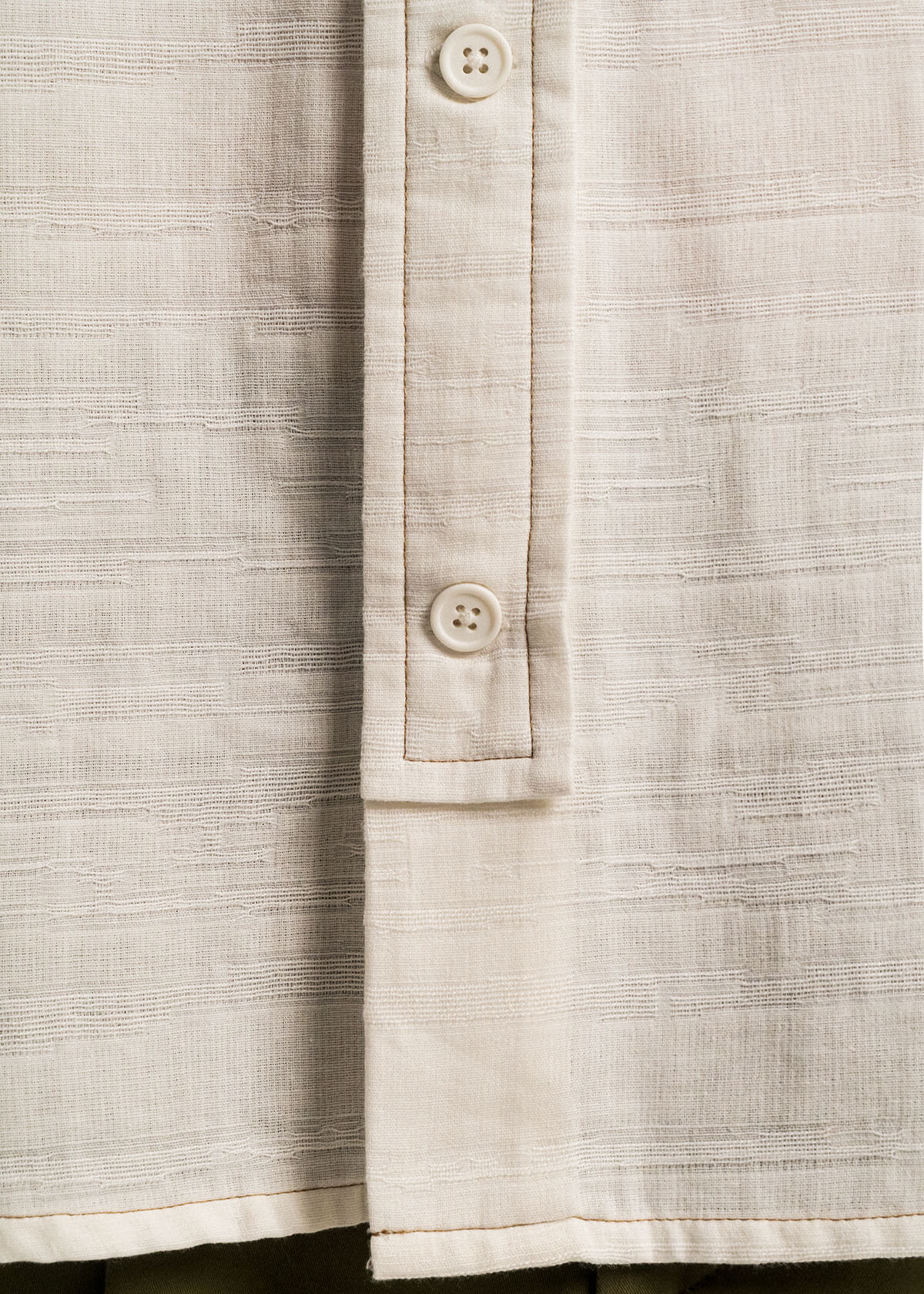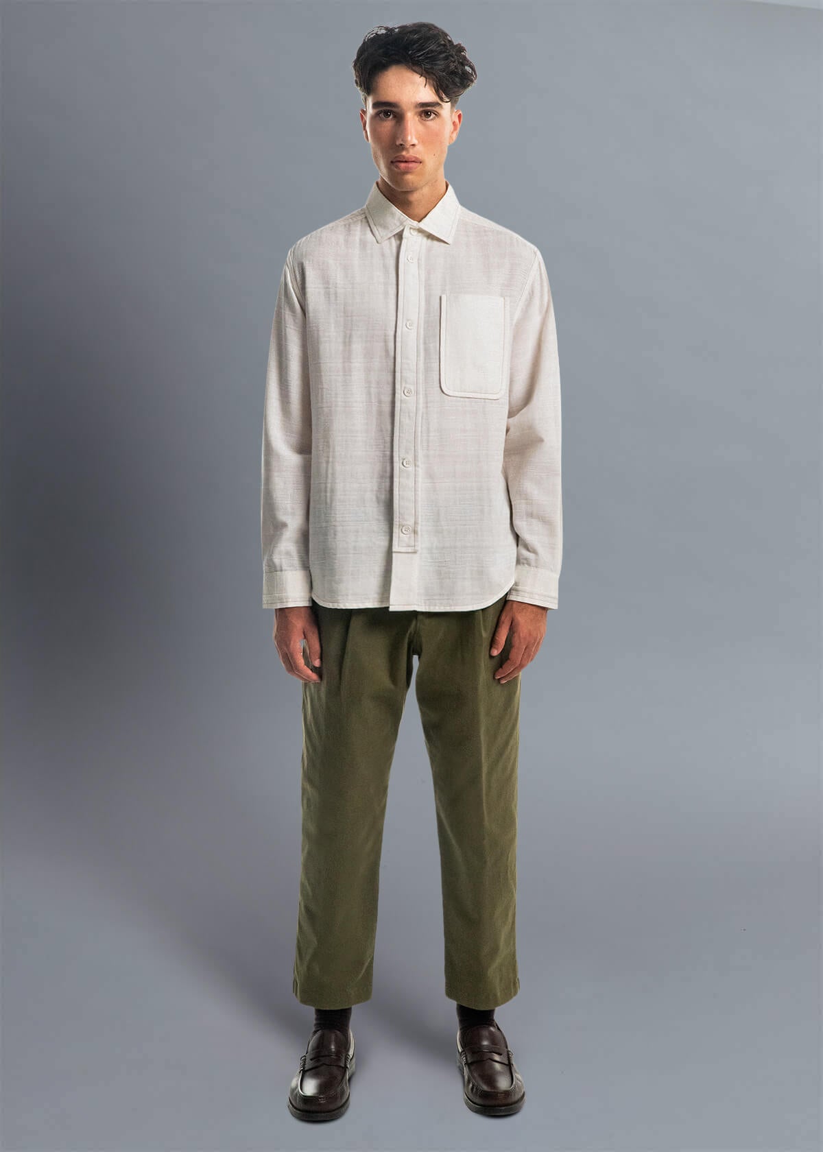 This shirt is made from a tonal slub fabric. Subtle horizontal ripples are woven into the surface. The floating front placket hovers above the hem's edge, adding an architectural touch. The oversized, rounded chest pocket shifts the proportions just enough to break from the standard. Take note of the stitching. Two thread colors run through this shirt, but not everywhere. The contrast appears on the placket and in other key places. Never across the whole shirt. Strategic, deliberate, never random. A quiet signal that every detail has been considered, and nothing is stitched without meaning..