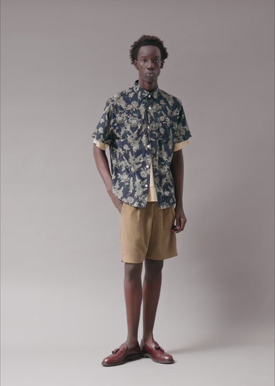 The Deadstock Print Black shirt features a hand-drawn ivory botanical motif printed across a black base. We found a rare deadstock fabric in our travels and bought the small supply that remained. Enough for a very limited run. Apart from being sustainable, these "lost fabrics" give you something extraordinarily unique to wear. Our mission is to create a limited number of extraordinary styles for a limited number of extraordinary individuals.