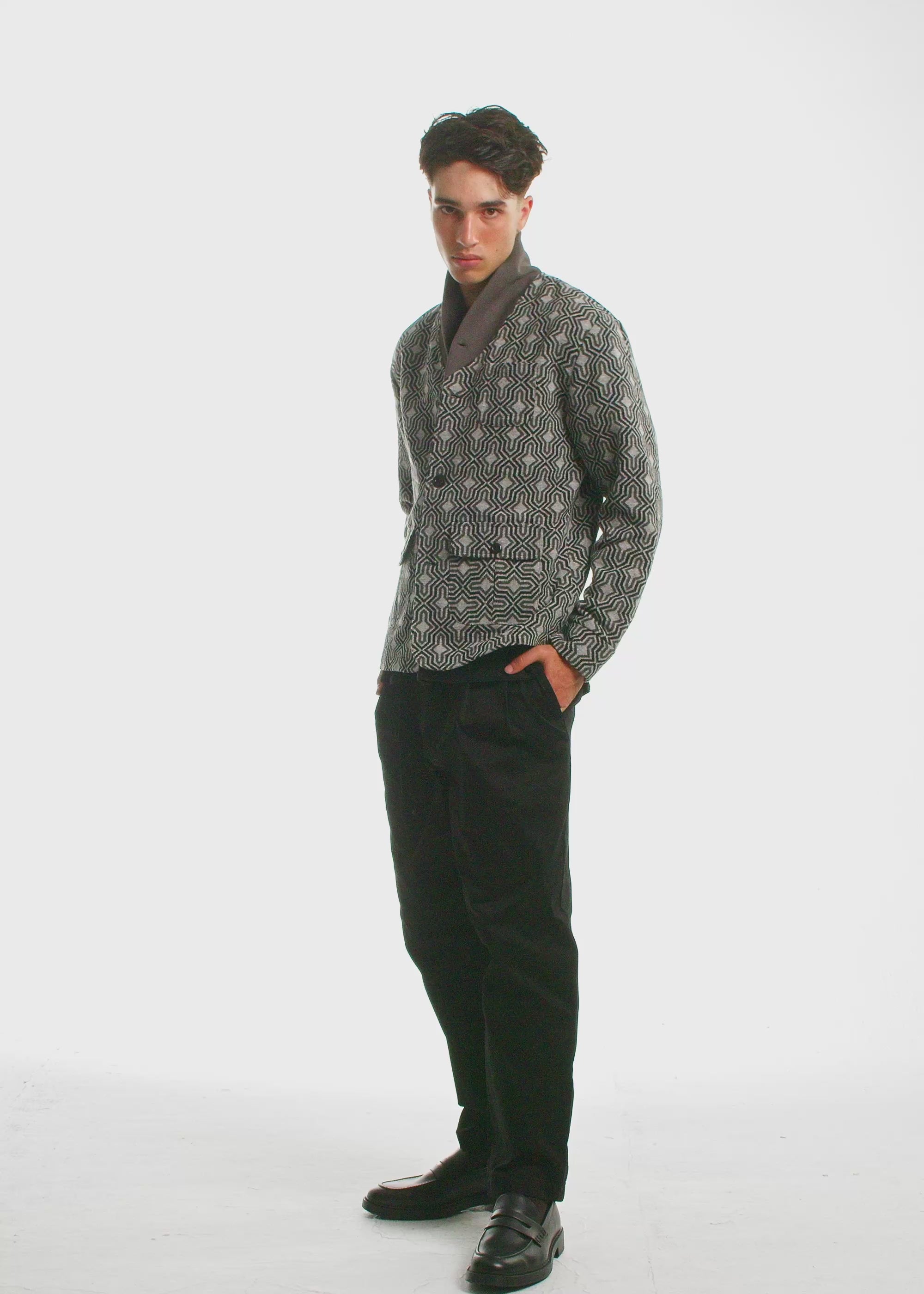 This shawl-collar cardigan features a repeating geometric maze pattern that plays tricks on the eye. The texture is heavy but not stiff, allowing the pattern to flex and shift as you move. Patch pockets are dropped low to break the symmetry, and the collar stands in soft contrast with a smoother finish.