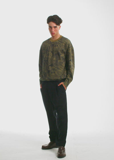 This crewneck carries our proprietary artwork, a mysterious botanical design. It's like a forgotten forest meets tapestry. The unique hem hides a drawstring, letting you cinch it at the waist for a tucked look without the tuck. A quiet sleight of hand. Finished with our Shadow Label, a discreet rectangular patch that mirrors the silhouette of our interior label. No logo, just a silent mark of belonging for those who wear Descendant of Thieves. This isn’t just something you wear. It’s something you collect.