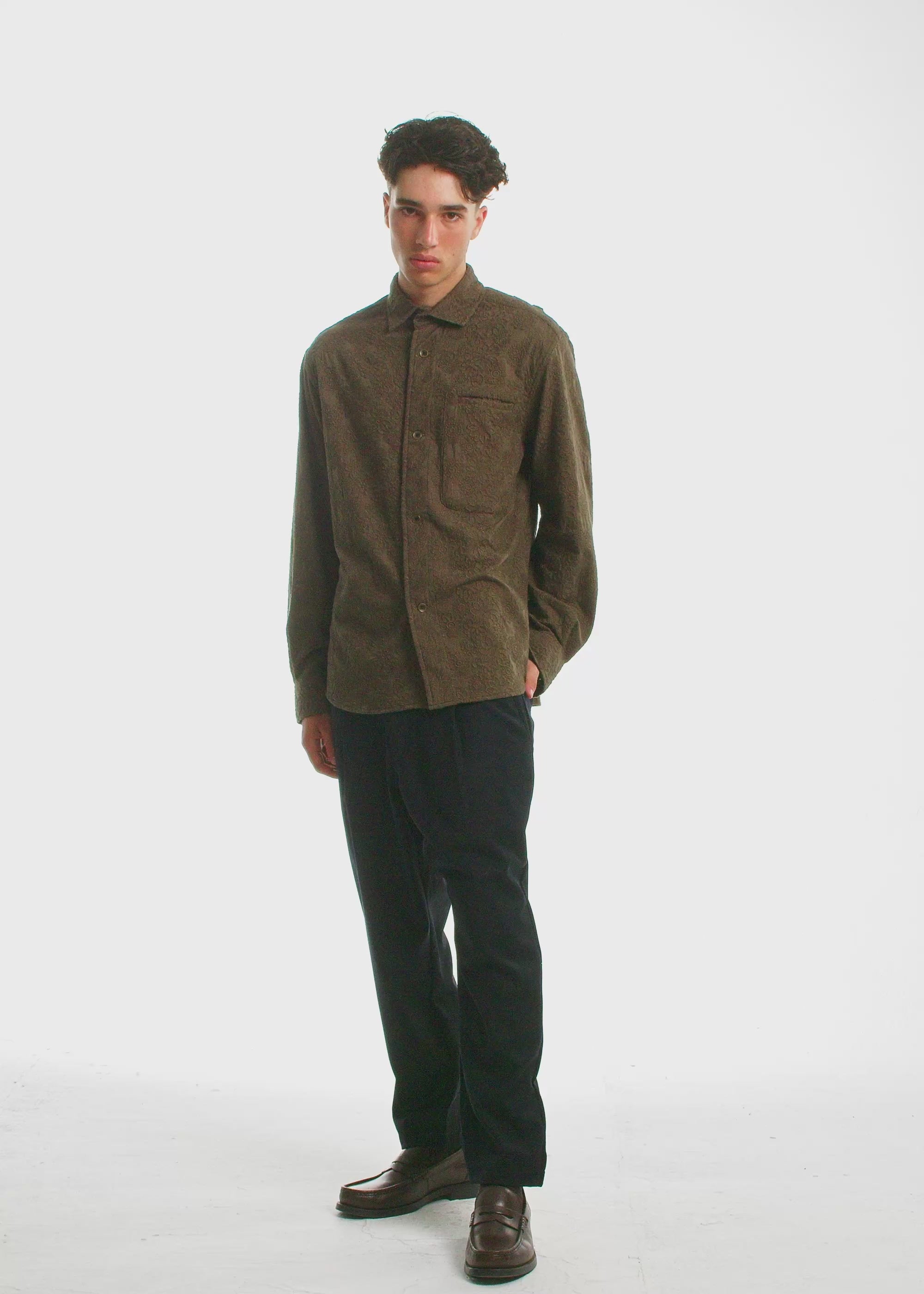 This shirt features a rich tonal floral embroidery, stitched layer by layer in a custom pattern. Each thread builds into the fabric, creating raised texture and depth that honors an ancient art form. The result is a shirt that stands in a category of its own. It redefines the solid: not flat, not plain, but alive with sculptural texture. A statement piece disguised as minimal. This is not just an addition to your wardrobe, it’s an addition to your art collection.