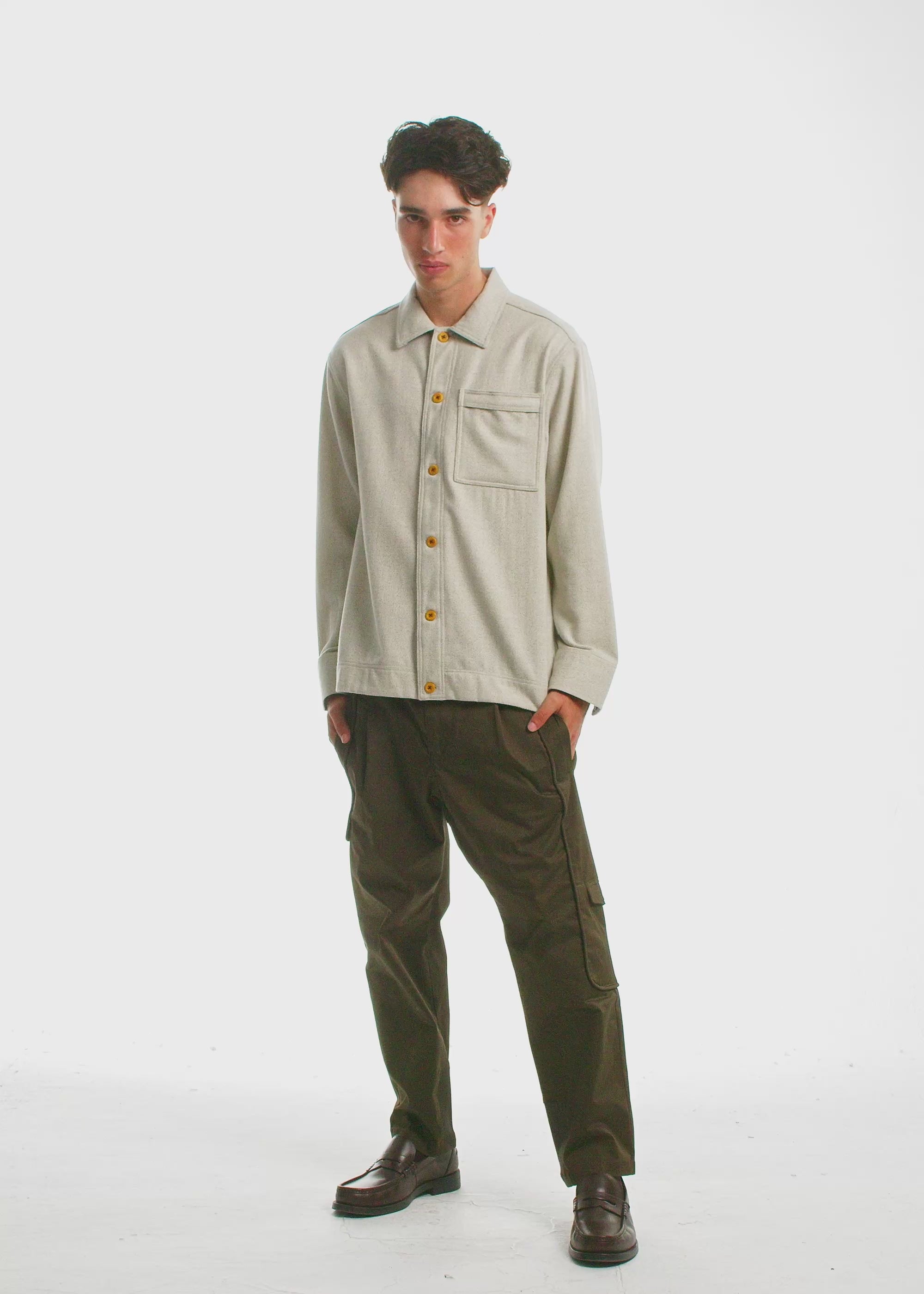 This shirt Jacket features a subtle two-tone micro jaquard woven into the fabric to add texture and depth. Reveals itself only when you’re close enough to notice. Understated on the surface. Layered in detail. The pattern is subtle, almost ghosted into the fabric. Burnt gold buttons break up the simplicity with sharp contrast.