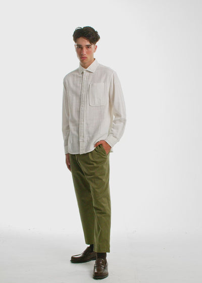 This shirt is made from a tonal slub fabric. Subtle horizontal ripples are woven into the surface. The floating front placket hovers above the hem's edge, adding an architectural touch. The oversized, rounded chest pocket shifts the proportions just enough to break from the standard. Take note of the stitching. Two thread colors run through this shirt, but not everywhere. The contrast appears on the placket and in other key places. Never across the whole shirt. Strategic, deliberate, never random. A quiet signal that every detail has been considered, and nothing is stitched without meaning..
